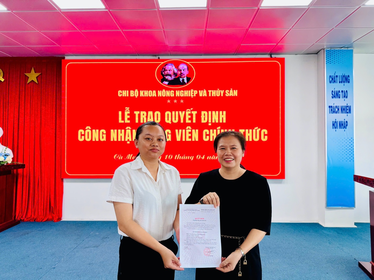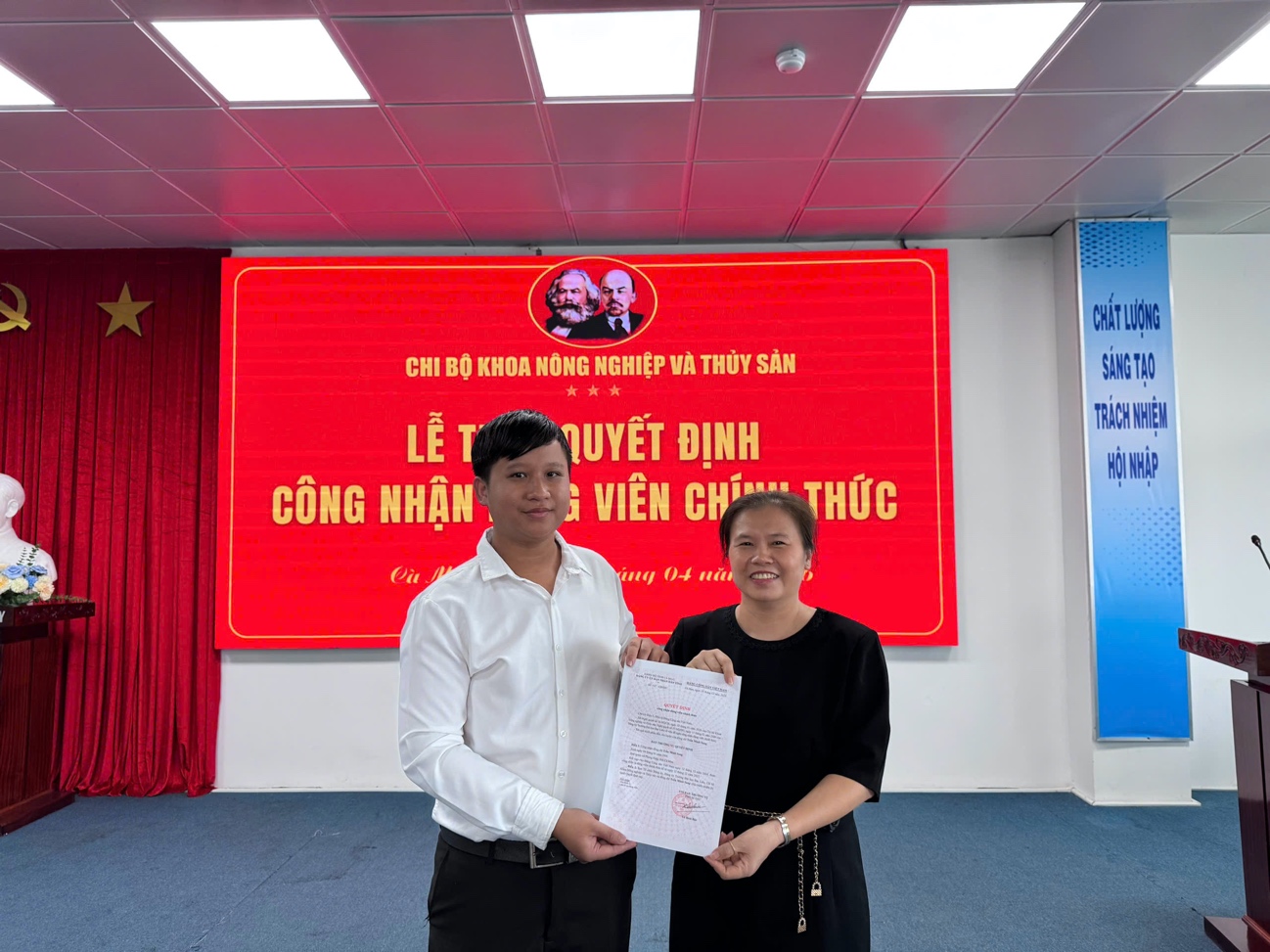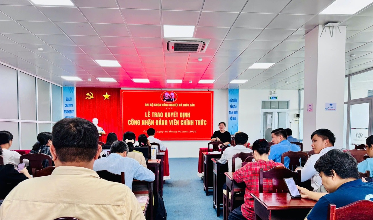 Thực hiện chương trình công tác Đảng tháng 4 năm 2026, vào ngày 10/4/2026, tại Hội trường Nhà điều hành, Chi bộ Khoa Nông nghiệp và Thủy sản đã tổ chức cuộc họp Chi bộ định kỳ. Trong chương trình làm việc, Chi bộ đã long trọng tổ chức Lễ trao quyết định công nhận Đảng viên chính thức cho 03 đồng chí đảng viên dự bị là sinh viên, gồm: Phan Kim Xuyến, Trần Thị Mỹ Phúc và Trần Minh Sang.