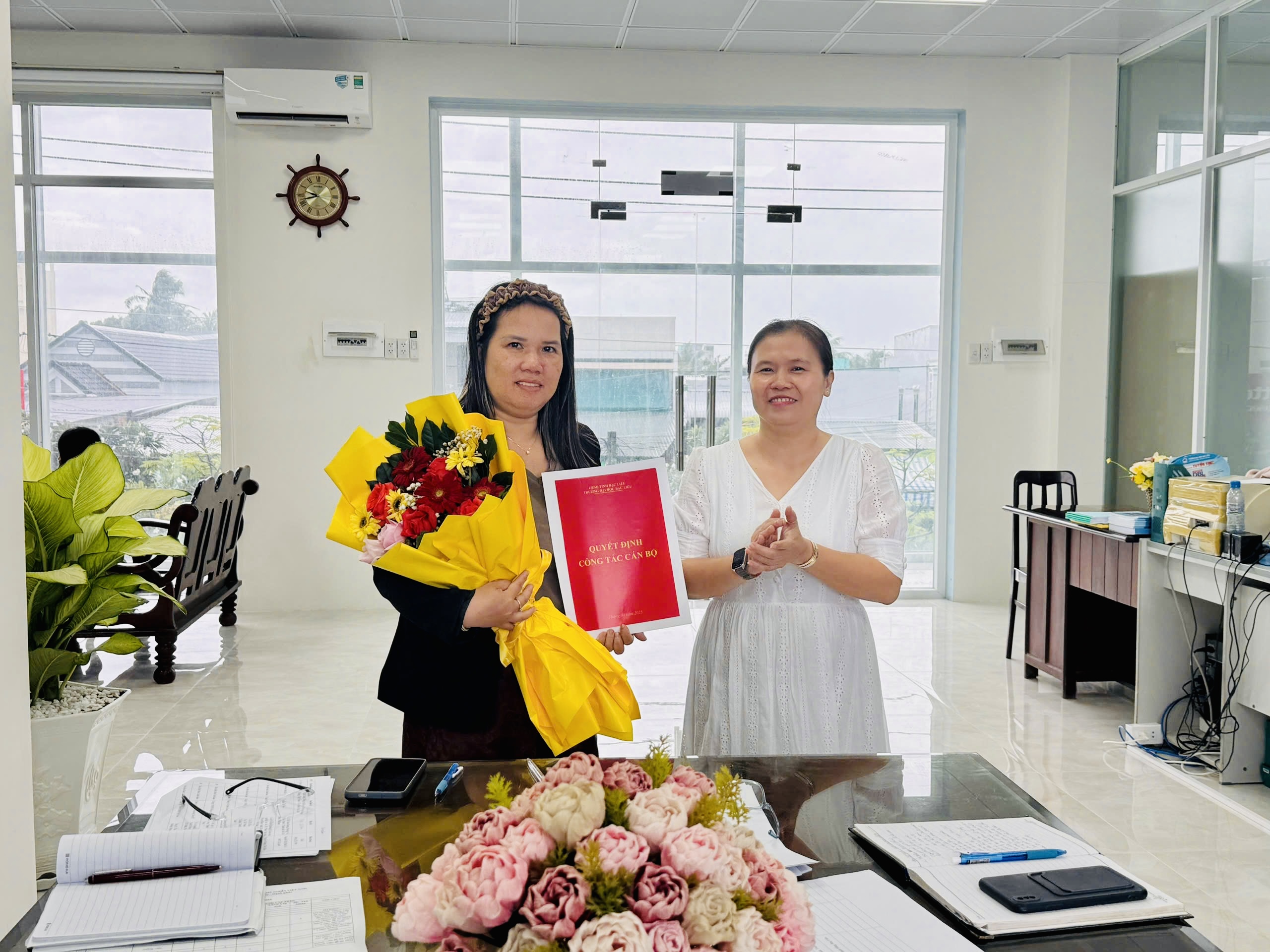 TS. Nguyễn Thị Kim Xuân trao Quyết định phân công phụ trách quản lý, điều hành Bộ môn Khoa học cây trồng và Phát triển nông thôn và tặng hoa chúc mừng TS. Mai Như Phương