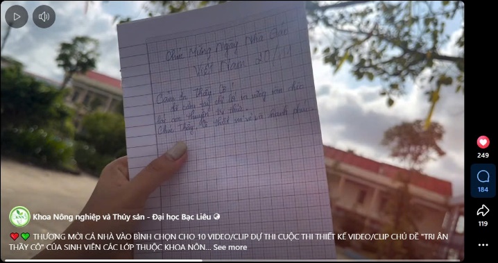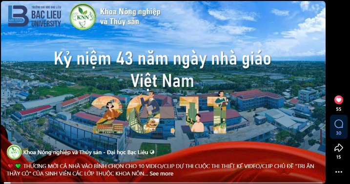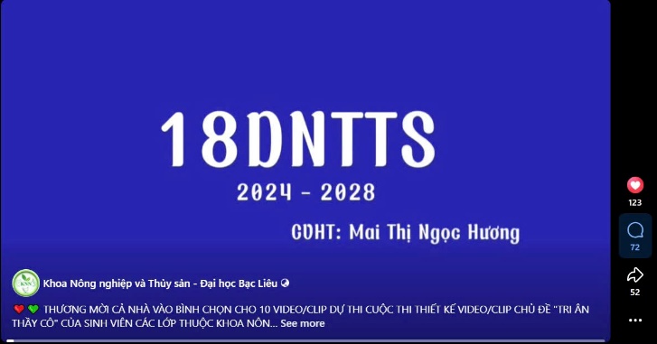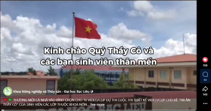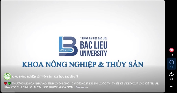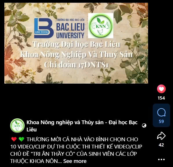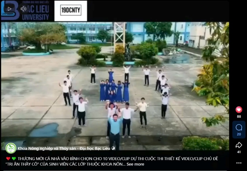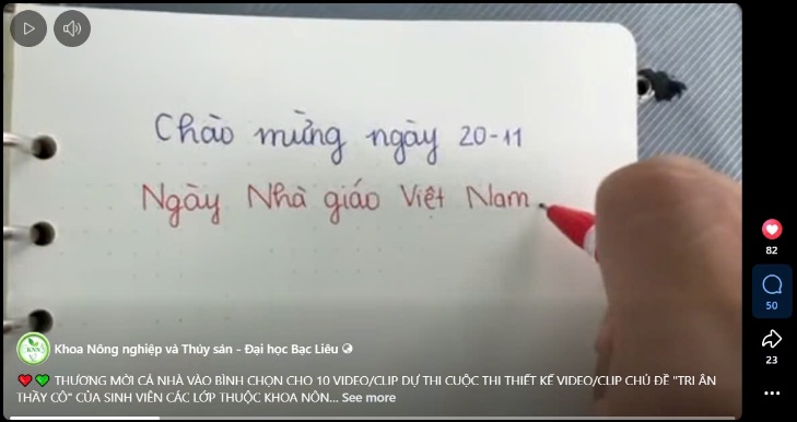 Hưởng ứng không khí tươi vui, ý nghĩa của Ngày Nhà giáo Việt Nam 20/11, với tinh thần hào hứng và trách nhiệm, Cuộc thi thu hút 17/22 tập thể lớp tham gia dự thi. Tất cả video/clip tham gia Cuộc thi hướng đến chia sẻ, thể hiện những lời tri ân, những hình ảnh, những hoạt động thiết thực của tập thể sinh viên lớp đến Quý thầy cô, Giảng viên nói chung và thầy cô Khoa Nông nghiệp và Thủy sản nói riêng với chủ đề “Tri ân Thầy Cô” mang đến nhiều sản phẩm video cảm xúc, sáng tạo và mang đậm dấu ấn riêng.