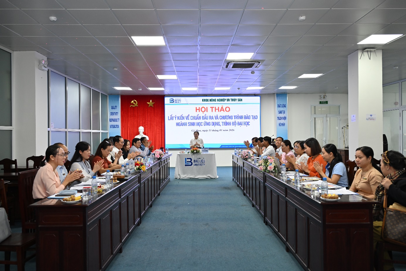 Nhằm thực hiện quy trình mở ngành đào tạo Sinh học ứng dụng (mã ngành 7420203, trình độ đại học), chiều ngày 13/01/2026, tại Hội trường Nhà điều hành, Khoa Nông nghiệp và Thủy sản, Trường Đại học Bạc Liêu đã tổ chức Hội thảo “Lấy ý kiến các bên liên quan về Chuẩn đầu ra và Chương trình đào tạo ngành Sinh học ứng dụng”. Hội thảo là bước quan trọng nhằm bảo đảm chương trình đào tạo được xây dựng đúng quy định của Bộ Giáo dục và Đào tạo, đồng thời phù hợp với yêu cầu thực tiễn của thị trường lao động. Thông qua việc lấy ý kiến từ cơ quan quản lý, doanh nghiệp, đơn vị sử dụng lao động và chuyên gia, Nhà trường hướng tới xây dựng một chương trình đào tạo hiện đại, gắn chặt nền tảng khoa học sinh học với năng lực ứng dụng trong các lĩnh vực nông nghiệp công nghệ cao như chọn tạo giống cây trồng, vật nuôi; xử lý phế phụ phẩm nông nghiệp; sản xuất chế phẩm vi sinh có ích. Qua đó, chương trình không chỉ góp phần đào tạo nguồn nhân lực chất lượng cao mà còn giữ vai trò quan trọng trong chiến lược phát triển kinh tế - xã hội của địa phương và cả nước.