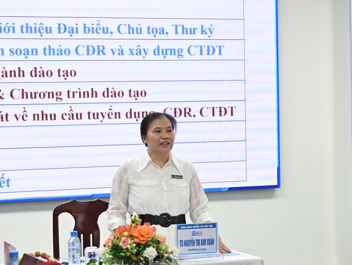 Hội thảo do TS. Nguyễn Thị Kim Xuân - Trưởng Khoa Nông nghiệp và Thủy sản - Chủ trì Hội thảo, TS. Lê Mỹ Phương - Thư ký Hội thảo, cùng TS. Nguyễn Văn Tuấn - Phó Trưởng khoa và Toàn thể Thành viên Hội đồng soạn thảo CĐR và xây dựng CTĐT ngành Sinh học ứng dụng.