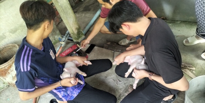 Sinh viên thực hành cắt đuôi cho heo con (trái) và tiêm sắt cho heo con (phải)