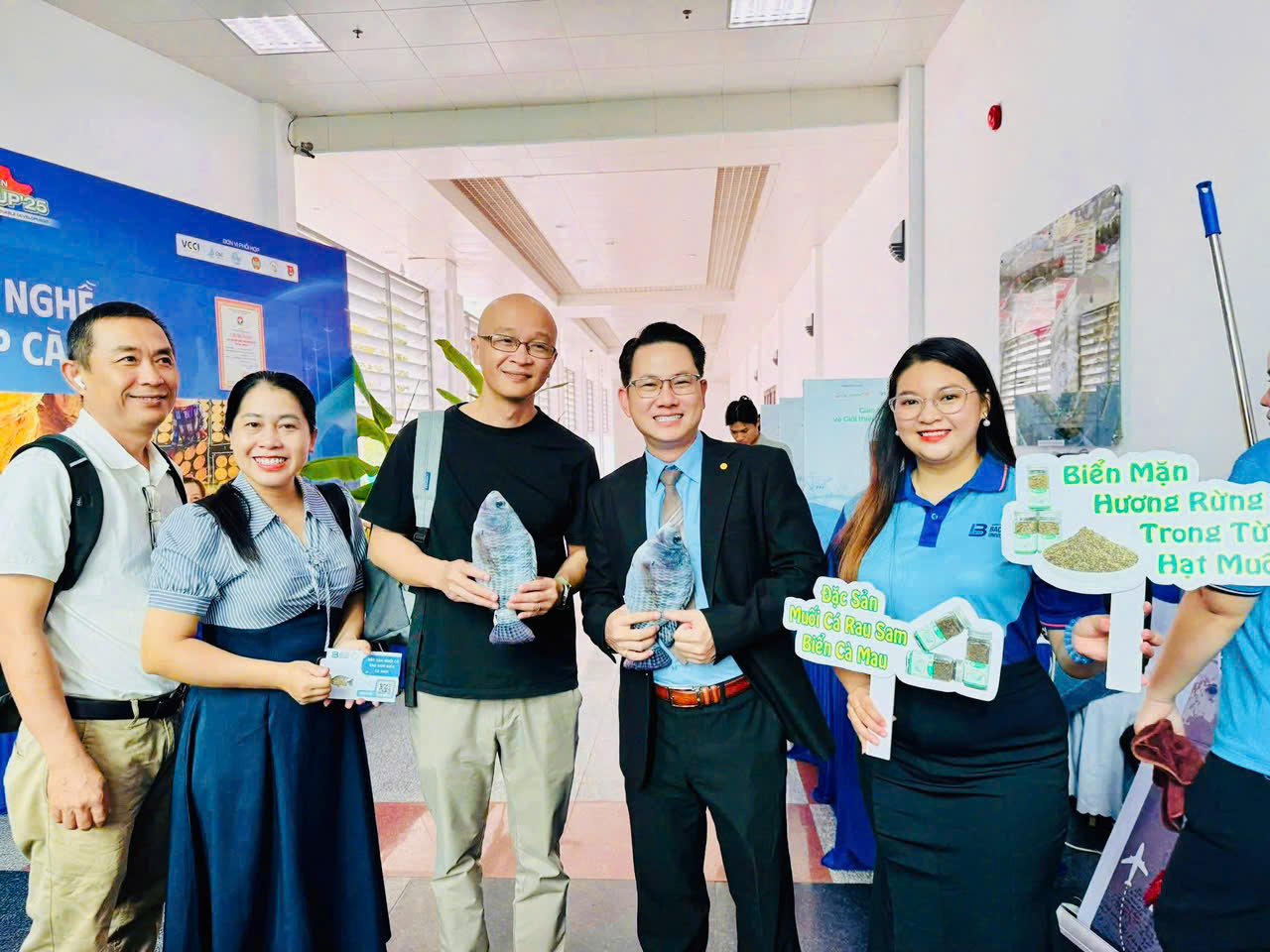 Nhóm dự án chụp ảnh lưu niệm cùng khách tham quan, nhà đầu tư tại gian hàng trưng bày và giới thiệu sản phẩm “Đặc sản Muối cá rau sam biển Cà Mau”