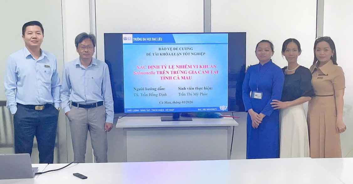 👉 Hội đồng 2 xét duyệt đề cương “Xác định tỷ lệ nhiễm vi khuẩn Salmonella spp. trên trứng gia cầm tại tỉnh Cà Mau” do sinh viên Trần Thị Mỹ Phúc thực hiện, dưới sự hướng dẫn của TS. Trần Hồng Định. Hội đồng xét duyệt gồm ThS. Nguyễn Tiến Sĩ - Chủ tịch, ThS. Mai Thị Ngọc Hương - Phản biện, ThS. Nguyễn Thanh Thư - Thư ký. Đề tài hướng đến việc khảo sát tình trạng nhiễm vi khuẩn Salmonella spp. trên trứng gia cầm tại tỉnh Cà Mau nhằm cung cấp thông tin thực tế phục vụ công tác kiểm soát an toàn vệ sinh thực phẩm và phòng ngừa nguy cơ lây nhiễm cho người tiêu dùng.